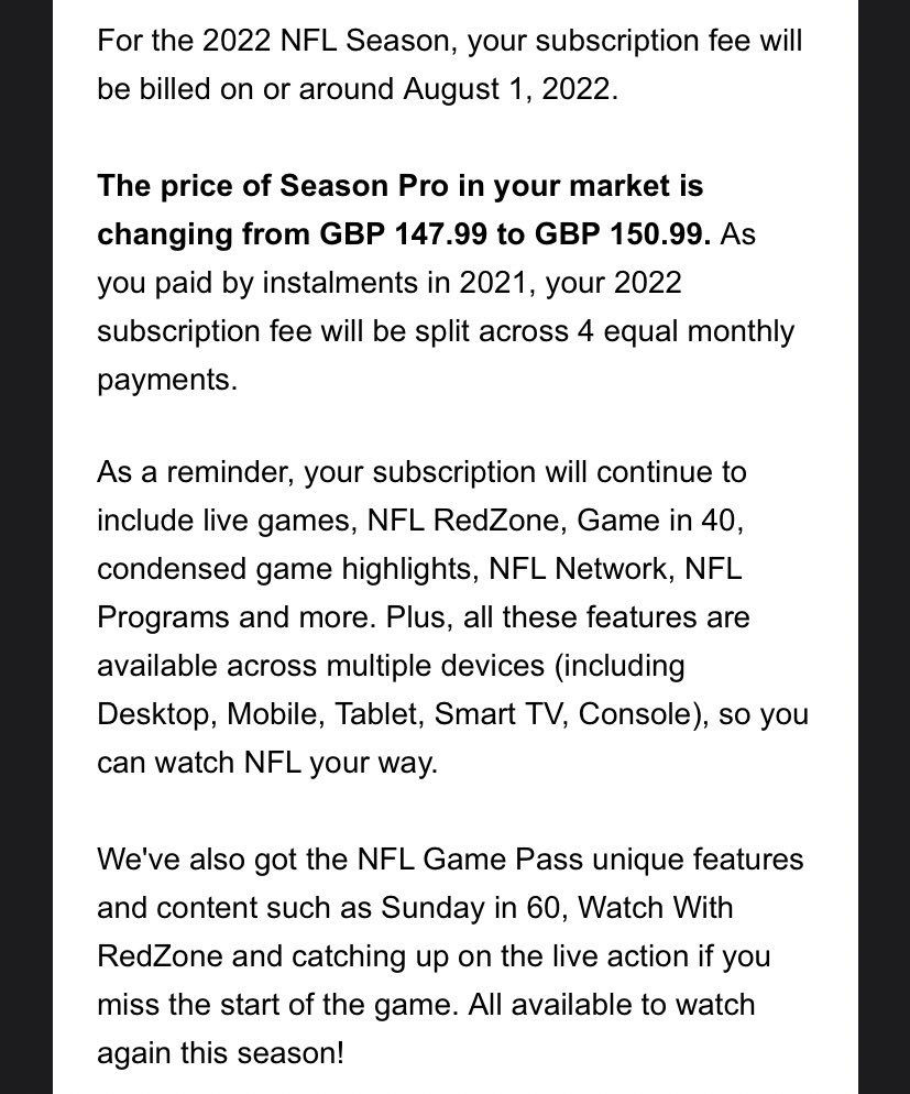 If you want to cancel or request a refund for a Free Trial click HERE. Not sure what that title is trying to say but if you cant access your Game pass account to cancel it another option is to call you bank or card provider and ask then to remove the continuous payment authority for NFL game pass. Blackout restrictions apply in the UKIRL during the regular season.